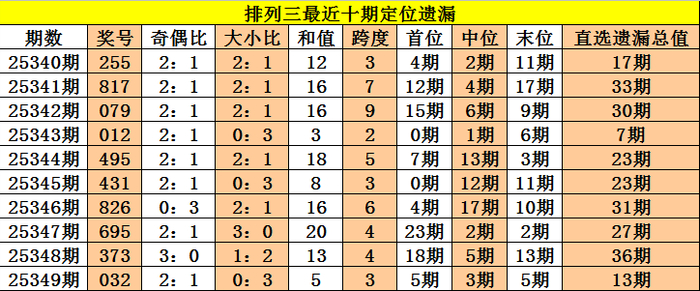 开奖回顾:排列三第2025349期奖号:032,定位直选遗漏值5期、3期、5期,遗漏总值为13期。