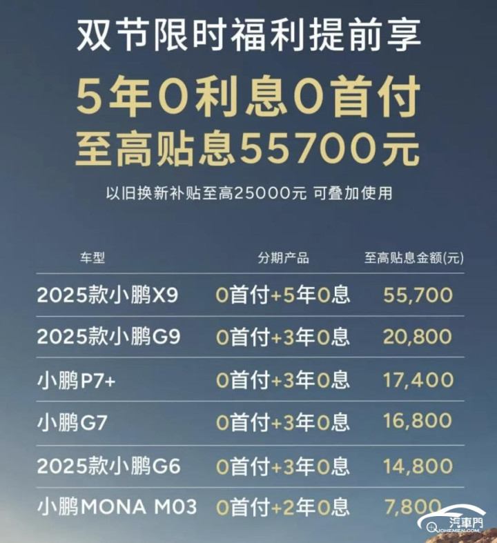 小鹏的优惠政策以金融贴息为主,现金优惠有限。这其中,2025款小鹏X9提供5年0息0手续费政策,至高贴息55700元;2025款小鹏G9、小鹏P7+、小鹏G7、2025款小鹏G6提供3年0息0首付,至高贴息20800元;小鹏MONA M03提供2年0息0首付,至高贴息7800元。另外,国庆期间购车赠送499元出行礼包,并享全国4100+高速充电站充电免服务费。但值得注意的是,活动截止至10月8日结束。