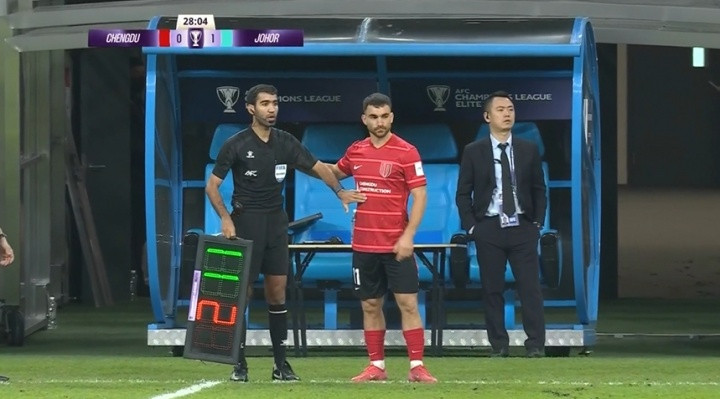 比赛第29分钟,成都蓉城做出换人调整,古尔芬克尔替补登场,胡荷韬被换下。场上比分蓉城0-1柔佛。