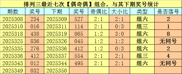 开奖回顾:排列三第2025349期开奖号码为:032。奖号类型为:组六,大小类型为:小小小,奇偶类型为:偶奇偶,包含重号:3。