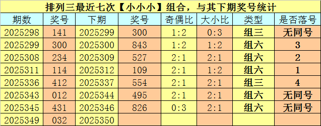 大小分析:排列三上期开出号码032,大小类型为【小小小】,最近七次开出大小类型小小小的奖号分别为:141、300、234、114、412、012、431,其下期分别开出号码:300、843、527、109、554、495、826。其中号码大小比为10:11,大小 号码基本平衡,本期预计小 号大热,重防全小组合开出。