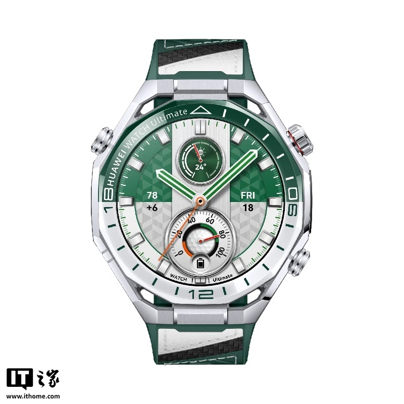 该手表采用绿白配色的纳米微晶陶瓷表圈,独特八边形设计搭配 1.5 英寸 LTPO 2.0 屏幕,3500 尼特峰值亮度,提供钛金属、素皮复合、氟橡胶三款表带。